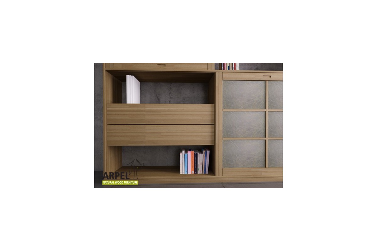 Anta Shoji con bacchettatura in stile giapponese. I due cassetti sono dotati di due sistemi differenti di apertura e chiusura. Il cassetto superiore ha guide scorrevoli blum con chiusura ammortizzata: il suo frontalino sporgendo in alto oltre il top della cassettiera offre una comoda impugnatura per la sua apertura. Il cassetto basso è dotato di guide scorrevoli con dispositivo di apertura premi - apri che consente l'automatica apertura del cassetto spingendo di poco il frontale verso l'interno. I due frontalini dei cassetti da chiusi appaiono lisci senza maniglie.