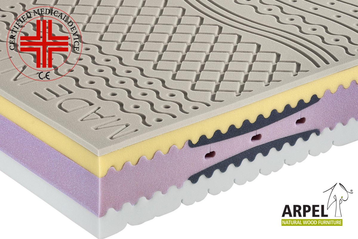 Elast-foam: è il terzo strato di colore viola. Questo strato è ha un ottima portanza ergonomica ed è altamente traspirabile. Garantisce quindi per una corretta circolazione d'aria nel materasso e manitene il corpo fresco e asciutto.