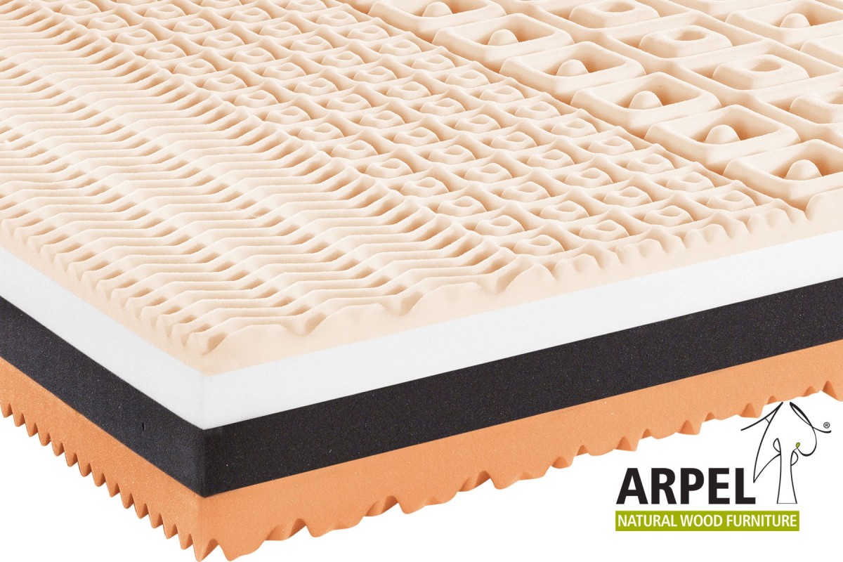 Puracell Medium: è lo strato di colore arancione e spessore 6 cm. Se giriamo il materasso anche la parte sottostante di questo materiale risulta essere lavorata ad onde a 7 zone differenziate e questo ne aumenta l'effetto di benessere per la colonna vertebrale. E' un materiale a cellula aperta molto traspirante che evita la formazione di muffe, un antiacaro naturale.