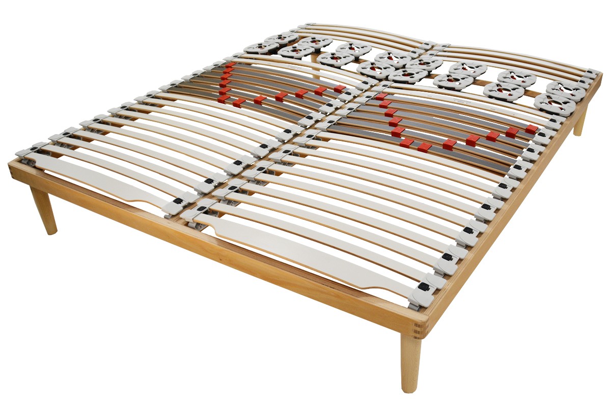 La rete a doghe Blossom in versione matrimoniale è provvista di due aste centrali che vanno dalla testa a i piedi della struttura. Le doghe sono suddivise in due gruppi separati per lato e ancorate indipendentemente alla propria asta centrale. La regolazione di rigidtà è quindi anch'essa personalizzabile indipendentemente per lato.
