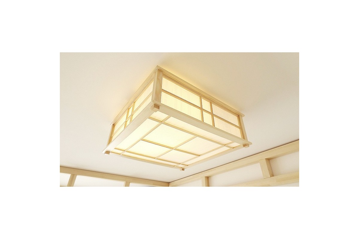Lampada da soffitto Hikari, realizzata in pregiato legno di abete massello e autentica carta di riso Shoji che diffonde la luce delicatamente nell'ambiente, creando un’atmosfera calda e rilassante.