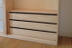 The chest of drawers with a metal sliding system Blum has soft-close dampers and drawer stops. Due to two safety devices underneath each drawer they can also be taken out completely. The runners are placed underneath the drawers and are therefore not visible. For this design the drawers are made of multilayered birch wood with lamellar beech fronts.