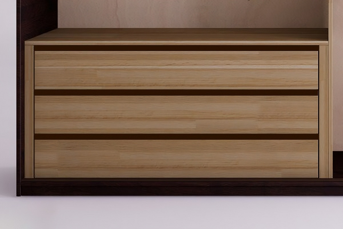 The chest of drawers module is available with different finishings it can be left unfinished, varnished with a transparent finish or in the same color as the exterior of the wardrobe.